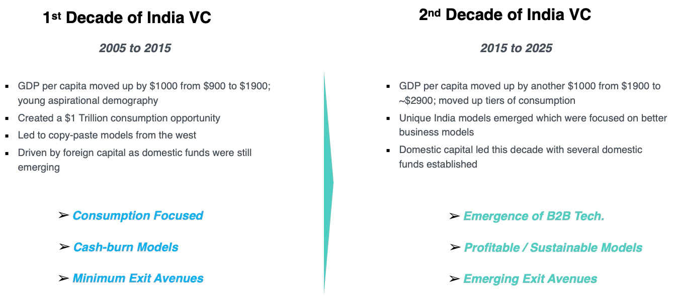There were homegrown funds that operated in the late 1990s and early 2000s, but the VC ecosystem really took off in 2005 when a number of global VC funds entered the Indian market attracted by the size of the market and a growing middle class. Per capita GDP went from ~$900 in 2005 to ~$1900 in 2015 and then to ~$2900 in 2025. With over 1B people, that translates to a $1T being added into the GDP every decade. Initially the focus of VC investing was on consumer models, specifically B2C, but the investors soon realized that the Indian consumer was very different from a western consumer and the number of cycles needed to cover customer acquisition cost was much larger than in the western markets, given the value focus of the consumer. Slowly after 2015, the market evolved to also invest in B2B models, where these were companies selling into enterprises, with better pricing power, stable and predictable metrics and visibility into account level profitability.